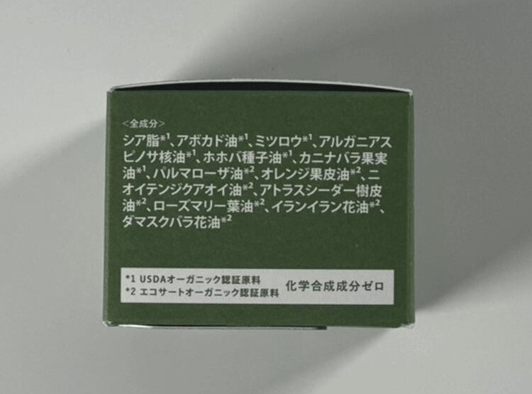 成分:シア脂、アボカド油、ミツロウ、アルガニアスピノサ油、メリアアザジラクタ種子油、パルマローザ油、オレンジ果皮油、ニオイテンジクアオイ油、アトラスシーダー樹皮油、ローズマリー葉油、イランイラン花油、ダマスクバラ花油